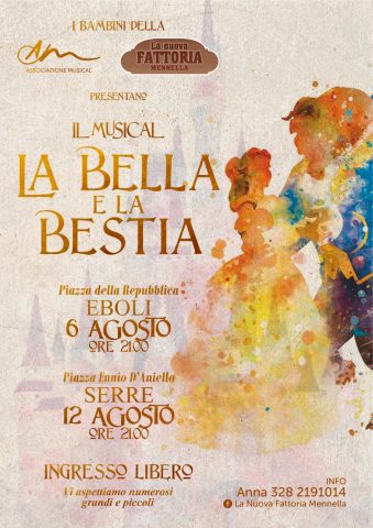 6 agosto Eboli Piazza della Repubblica, 12 agosto Serre, Piazza D’Aniello, ore 21.00, Musical La Bella e la Bestia.