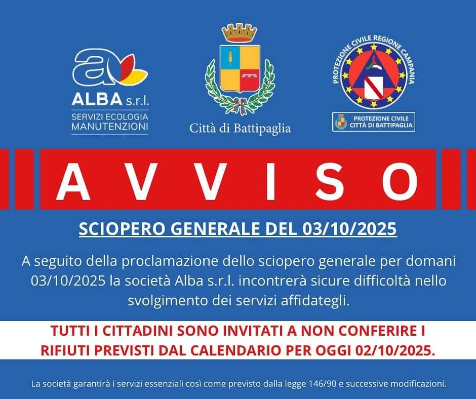 BATTIPAGLIACon riferimento alla Proclamazione dello Sciopero Generale Nazionale indetto per domani venerdì 3 ottobre 2025 dalla FP CGIL la Società Alba Srl incontrerà sicure difficoltà nel garantire il regolare svolgimento dei servizi affidati.