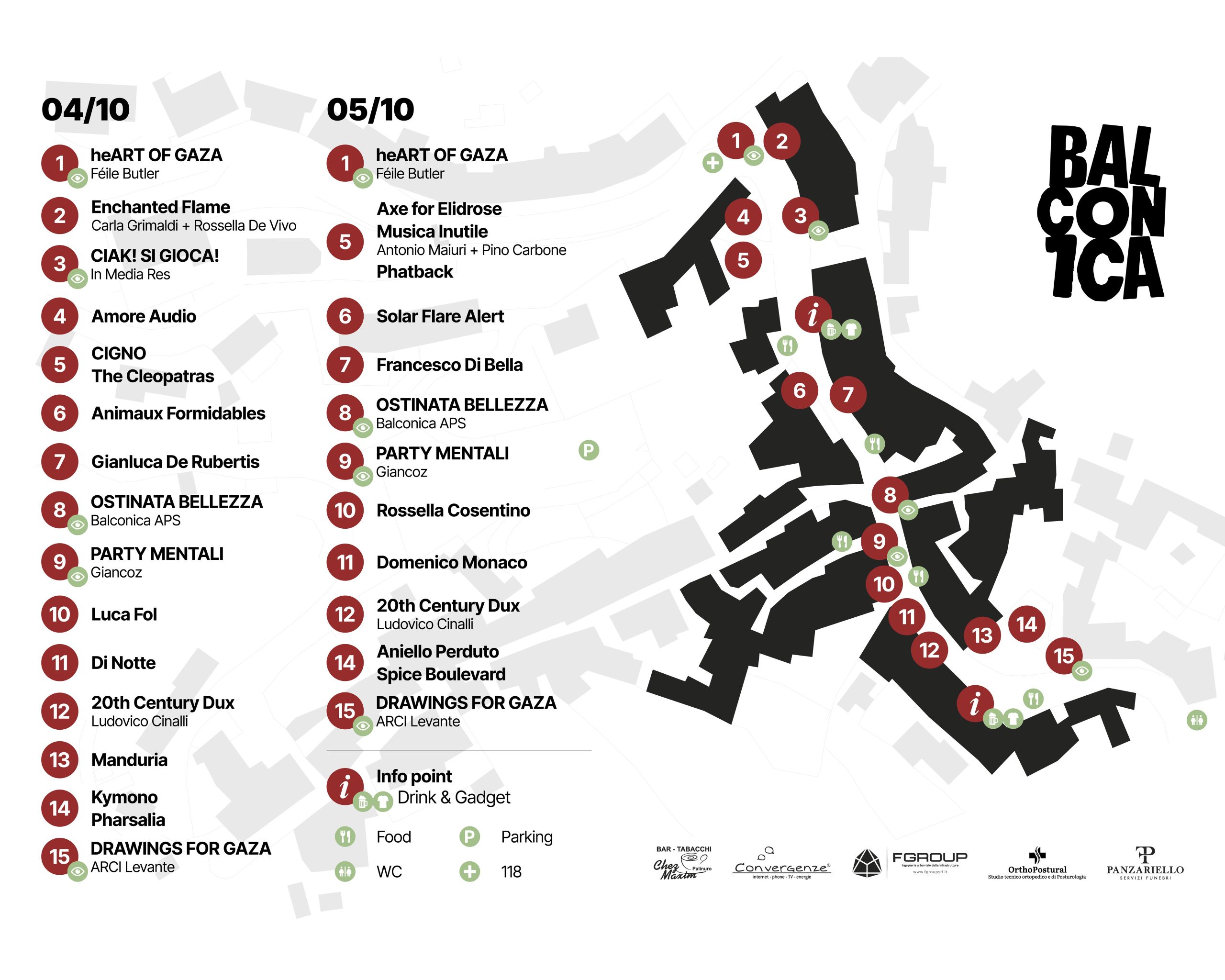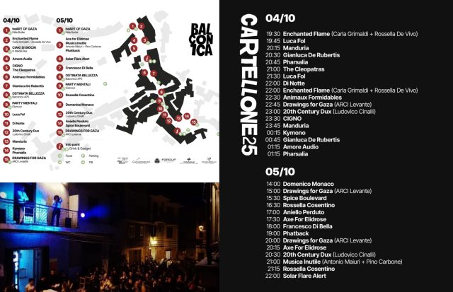 Accanto alla musica e alle performance, il pubblico potrà infatti visitare anche mostre ed esposizioni come CIAK! SI GIOCA! (a cura di In Media Res), Drawings for Gaza (a cura di Arci Levante), Party Mentali (a cura di Giancoz), heART of Gaza (a cura di Féile Butler) e Ostinata Bellezza (a cura di Balconica APS).