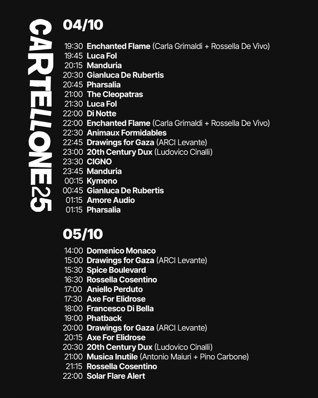 Il festival prenderà il via sabato 4 ottobre alle ore 19:00, proseguendo fino a notte fonda. Una maratona musicale che vedrà alternarsi sui balconi nomi come Manduria, one man band dal suono lo-fi e travolgente, Animaux Formidables con il loro garage-fuzz istintivo, e i bolognesi Kymono, collettivo che fonde funk, disco e house dal vivo. Il cantautore Luca Fol, reduce da X-Factor e da un nuovo disco, porterà il suo sound tra pop ed elettronica, mentre le storiche The Cleopatras accenderanno la notte con il loro punk-rock irriverente. Spazio anche alle nuove voci più radicali della scena, come i Pharsalia, il duo elettronico Amore Audio, l’ipnotico spettacolo tra violino, elettronica e fuoco di Enchanted Flame (Carla Grimaldi e Rossella De Vivo), fino all’eleganza cantautorale di Gianluca De Rubertis. La line-up sarà arricchita da Di Notte, duo post-punk che fonde chitarre abrasive e drum machine liquide, e con Cigno, che tra spoken word, post-punk e techno trasforma i suoi brani in liturgie elettrificate e rituali politici, capaci di catturare e scuotere il pubblico, dal teatro sonoro e ironico di 20th Century Dux (Ludovico Cinalli), e dagli Spice Boulevard, vincitori del contest “Marmellate on the beach”.
