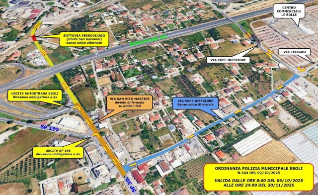 EBOLI – Dopo una lunga e partecipata riunione operativa svoltasi ieri a Palazzo di Città, alla quale hanno partecipato: RFI, ANAS, Polizia Stradale, Carabinieri, Guardia di Finanza, Polizia Municipale e Amministrazione comunale, per ridurre al minimo i disagi alla popolazione e diminuire i rischi di incidenti, vista la necessità di eseguire i lavori non più procrastinabili, è stata concordata la seguente ordinanza (n. 344 del 2 ottobre 2025):