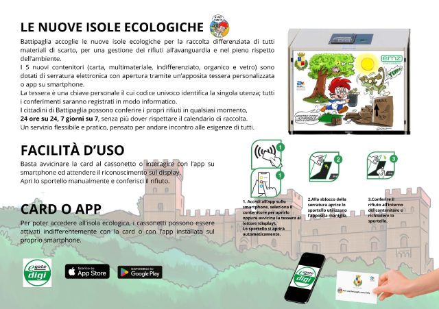 Battipaglia accoglie le nuove isole ecologiche per la raccolta differenziata di tutti materiali di scarto, per una gestione dei rifiuti all’avanguardia e nel pieno rispetto dell’ambiente. I 5 nuovi contenitori per la (carta, multimateriale, indifferenziato, organico e vetro) sono dotati di serratura elettronica con apertura tramite un’apposita tessera personalizzata o app su smartphone. La tessera è una chiave personale il cui codice univoco identifica la singola utenza; tutti i conferimenti saranno registrati in modo informatico. I cittadini di Battipaglia possono conferire i propri rifiuti in qualsiasi momento, 24 ore su 24, 7 giorni su 7, senza più dover rispettare il calendario di raccolta. Un servizio flessibile e pratico, pensato per andare incontro alle esigenze di tutti.