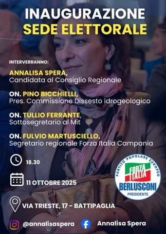 Sabato 11 ottobre, alle ore 18.30, in Via Trieste, 17, di Battipaglia, si terrà l’inaugurazione della Sede elettorale di Annalisa Spera, candidata al Consiglio regionale della Campania nella Lista di Forza Italia. Spera: “Sarà un luogo di condivisione, di confronto e di suggerimenti”.