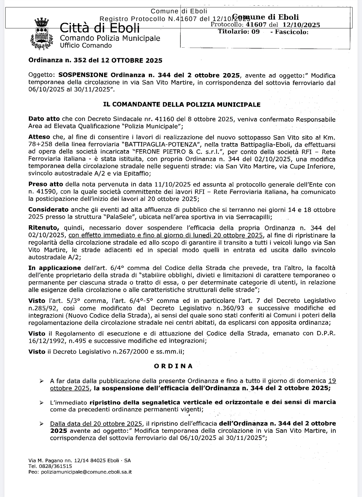 EBOLI – Con nuova ordinanza, la n. 352 del 12 ottobre, pubblicata all’Albo pretorio, – si legge in una nota stampa di Palazzo di Città di Eboli – il Sindaco, in accordo con il Comandante della Polizia Municipale, sulla base della comunicazione ricevuta dalla ditta esecutrice dei lavori per conto di Rfi, ha deciso di sospendere il dispositivo di traffico che istituiva il senso unico alternato su via Cupe fino al 19 ottobre per eseguire i lavori sul Ponte di San Giovanni.