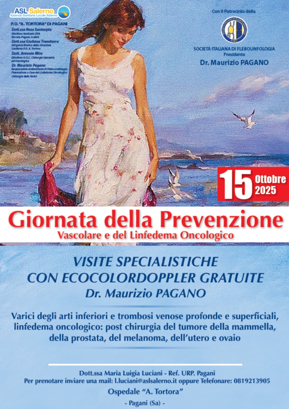 PAGANI – L’ASL Salerno, con il patrocinio della Società italiana di Flebologia (SIFL), promuove la “Giornata della prevenzione vascolare e del linfedema oncologico” all’Ospedale “Andrea Tortora” di Pagani, dove sarà possibile dal 15 ottobre effettuare visite specialistiche gratuite con ecocolordoppler presso l’ambulatorio di “Flebologia, linfologia, prevenzione e cura del linfedema oncologico” diretto da Maurizio Pagano, presidente SIFL.