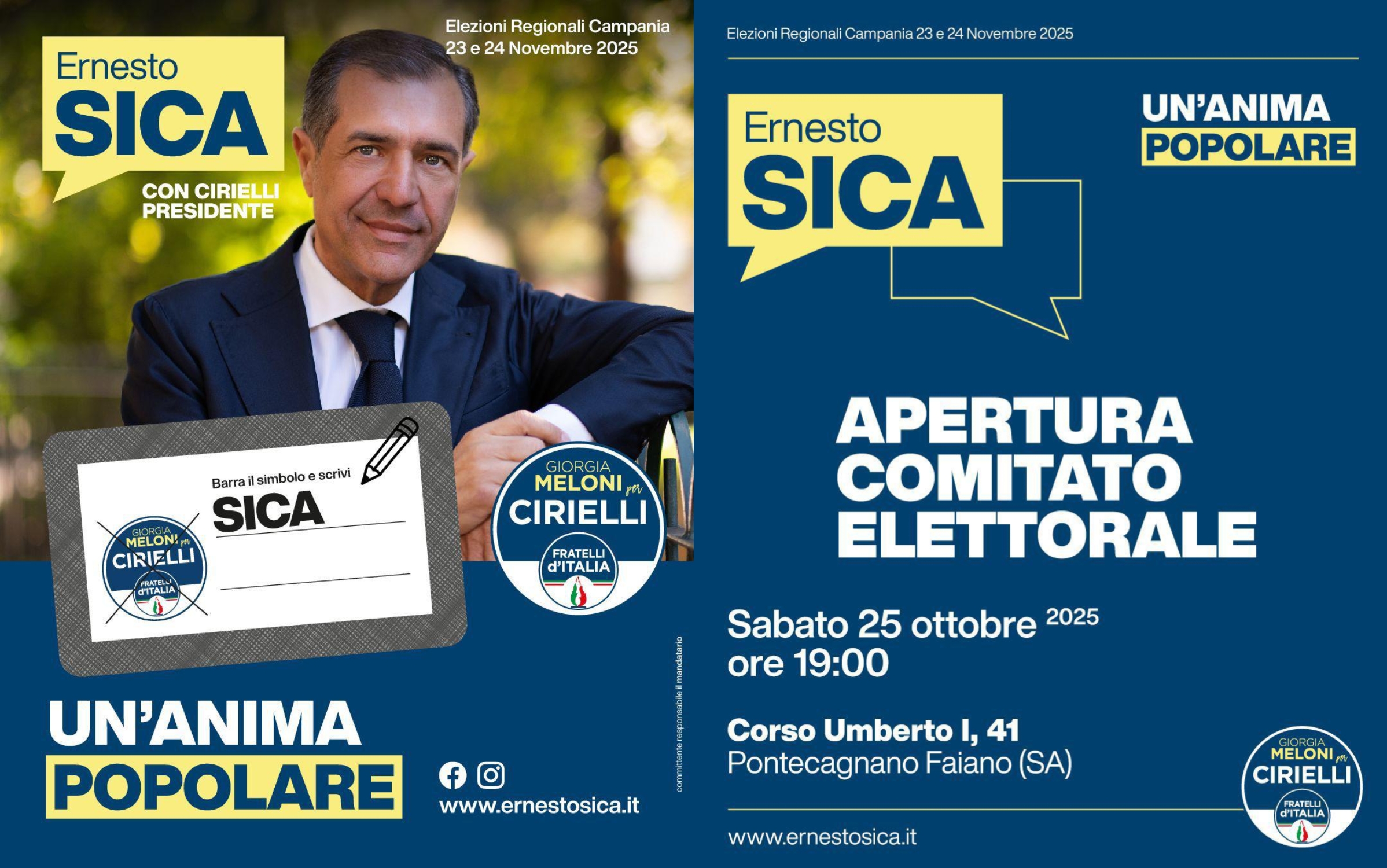 PONTECAGNANO FAIANO – Sabato 25 ottobre, alle ore 19:00, in Corso Umberto I, 41 di Pontecagnano Faiano, si terrà l’inaugurazione del Comitato Elettorale di Ernesto Sica, candidato al Consiglio Regionale della Campania nella Lista di Fratelli d’Italia a sostegno di Edmondo Cirielli candidato a Governatore del Centrodestra.