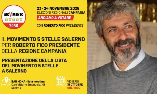 Venerdì 31 ottobre, ore 18:00, Bar Moka, corso Vittorio Emanuele, Salerno, il Movimento 5 Stelle presenta i candidati salernitani al consiglio regionale della Campania e il candidato presidente Roberto Fico. Saranno presenti l’on. Sergio Costa, e il vicepresidente del M5S, Michele Gubitosa.