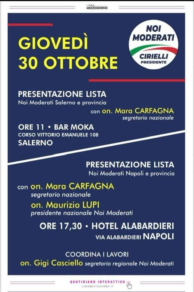 Doppio appuntamento elettorale giovedì 30: Ore 11.00 Bar Moka Salerno; Ore 17.30 Hotel Alabardieri Napoli con Mara Carfagna e Maurizio Lupi per la presentazione delle Liste di “Noi Moderati” a sostegno di Edmondo Cirielli Candidato a Presidente.
