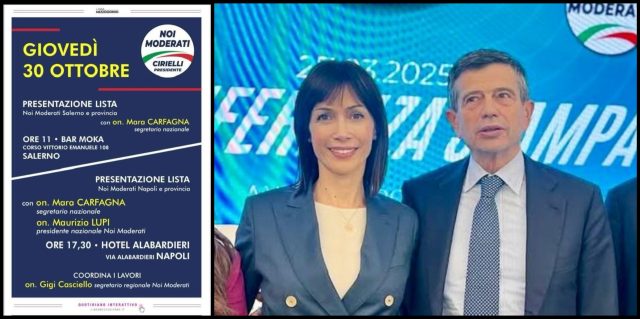 NAPOLI / SALERNO – Doppio appuntamento elettorale a Napoli e a Salerno per Noi Moderati con il Presidente Nazionale Maurizio Lupi e la Segretaria Nazionale Mara Carfagna che giovedì 30 ottobre presenteranno le Liste provinciali, a sostegno del candidato presidente del Centrodestra alla Regione Campania Edmondo Cirielli. Due appuntamenti ai quali parteciperanno i vertici nazionali del partito e quelli Regionali, provinciali e locali. Il primo appuntamento è alle ore 11.00, nel Salone delle conferenze del Bar Moka, in corso Vittorio Emanuele a Salerno, laddove si terrà la presentazione della lista della circoscrizione Salerno, alla presenza dell’on. Mara Carfagna. Il secondo appuntamento è alle ore 17.30, all’Hotel Palazzo Alabardieri di Napoli, per la presentazione ufficiale della lista della Circoscrizione di Napoli, per l’occasione oltre alla Segretaria Nazionale di “Noi Moderati” Mara Carfagna ci sarà anche la partecipazione del presidente del partito, Maurizio Lupi, e del coordinatore regionale campano Gigi Casciello.