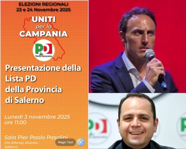 SALERNO – Lunedì 3 novembre, – si legge in una nota del Segretario Provinciale del Partito Democratico di Salerno Vincenzo Luciano, alle ore 11.00, presso la Sala Pier Paolo Pasolini, in via Alfonso Alvarez in Salerno, il Partito Democratico della Provincia di Salerno presenterà i 9 candidati della lista PD Circoscrizione di Salerno, per le prossime elezioni regionali del 23 e 24 novembre p.v..