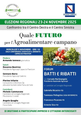 5 Novembre, ore 18.00, Sala Conferenze Caseificio “Il Granato”, Paestum, convegno Agrocepi Campania: “Quale Futuro per l’Agroalimentare campano” e il Forum “Batti e ribatti”; Centrodestra e Centrosinistra a confronto.
