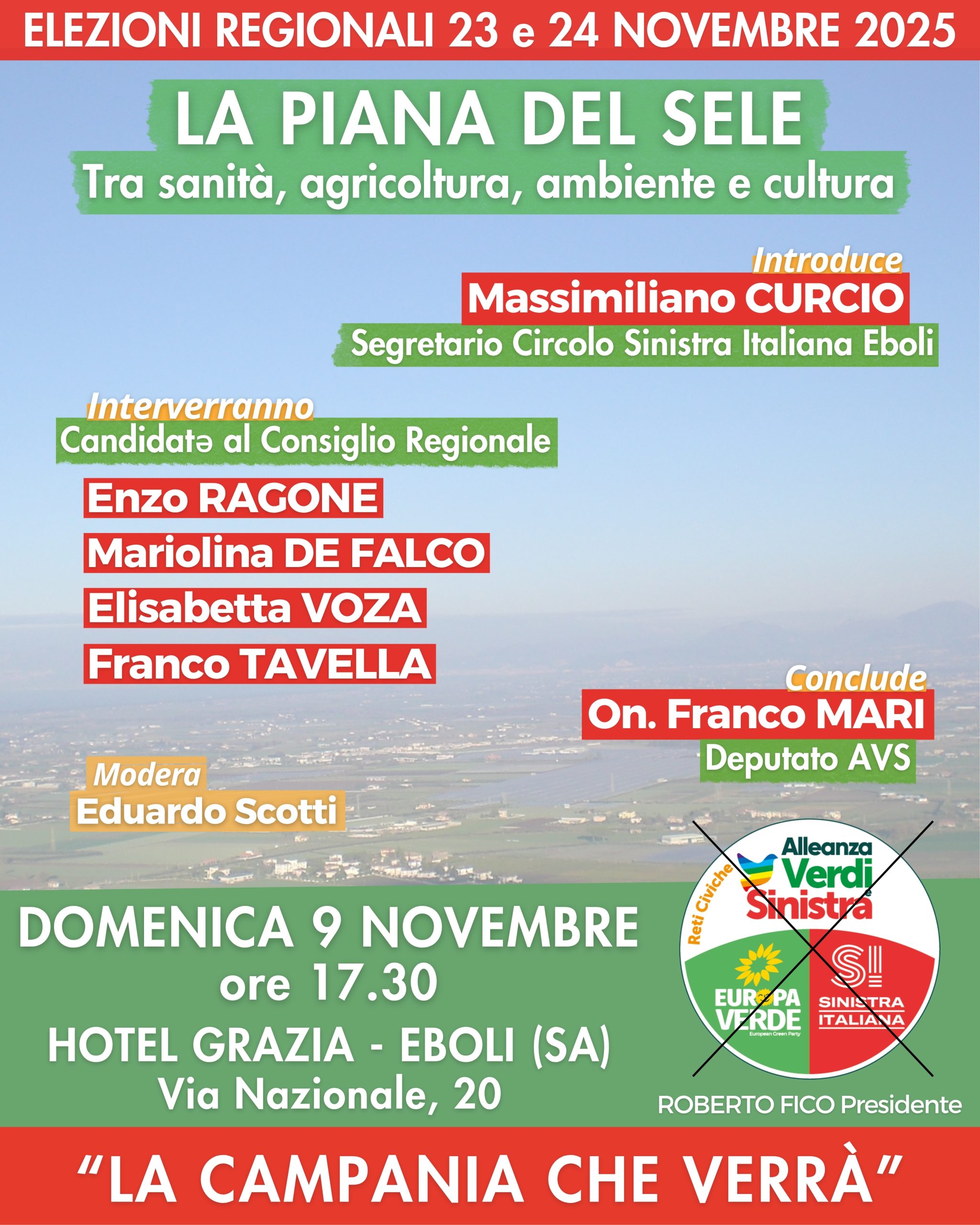 Domenica 9 novembre, ore 17.30, Hotel Grazia Eboli, incontro di Alleanza Verdi Sinistra: “La Campania che verrà – La Piana del Sele tra Sanità, Agricoltura, Ambiente e Cultura con Curcio Ragone, De Falco, Voza, Tavella, e Franco Mari.