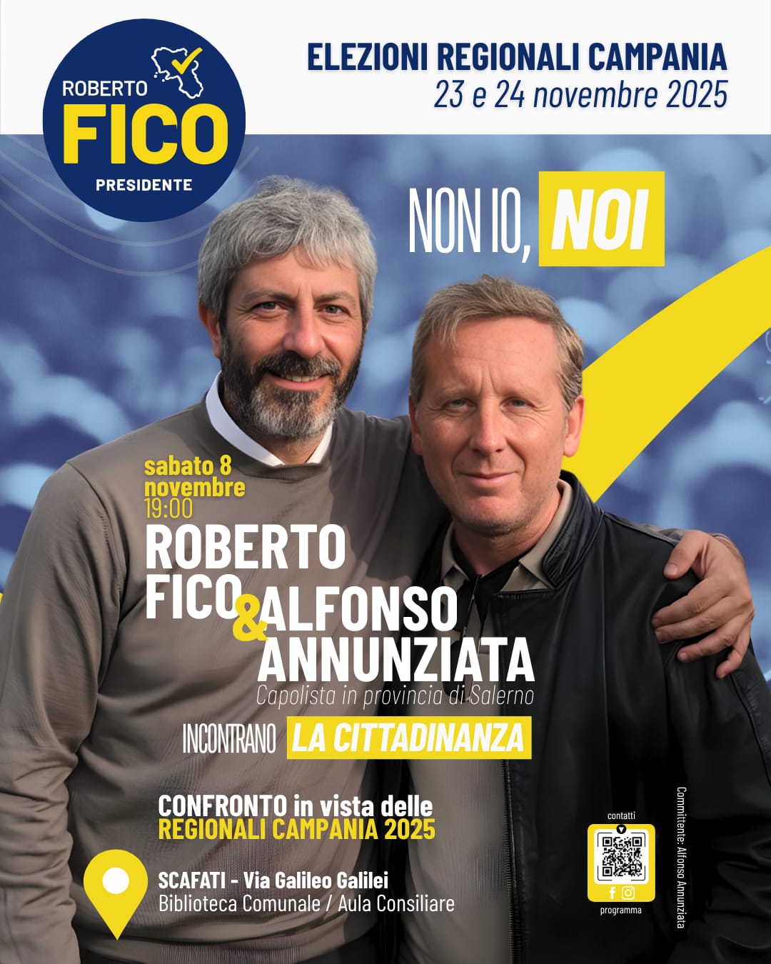 CAFATI – Sabato 8 novembre, alle ore 19 presso la biblioteca comunale “Francesco Morlicchio” di Scafati, il candidato governatore della Campania Roberto Fico per la coalizione del centro sinistra fa tappa a Scafati e incontrerà la comunità dell’Agro nocerino sarnese assieme all’avvocato Alfonso Annunziata.
