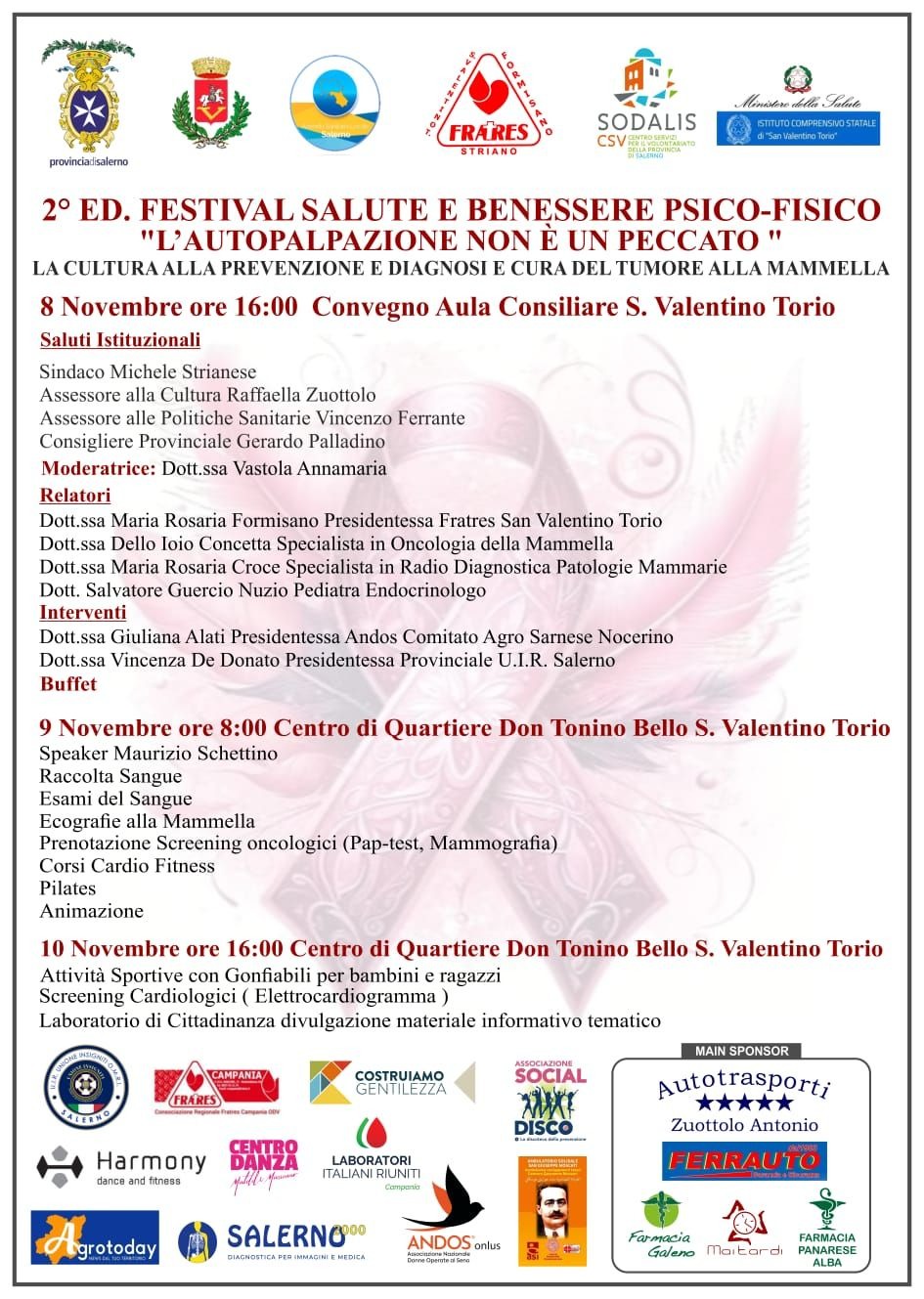 L’iniziativa, patrocinata da Provincia di Salerno, Comune di San Valentino Torio, Ministero della Salute, Fratres Striano e Istituto Comprensivo Statale “San Valentino Torio”, conferma l’impegno del territorio nella promozione di una cultura della prevenzione oncologica e del benessere psico-fisico della cittadinanza.