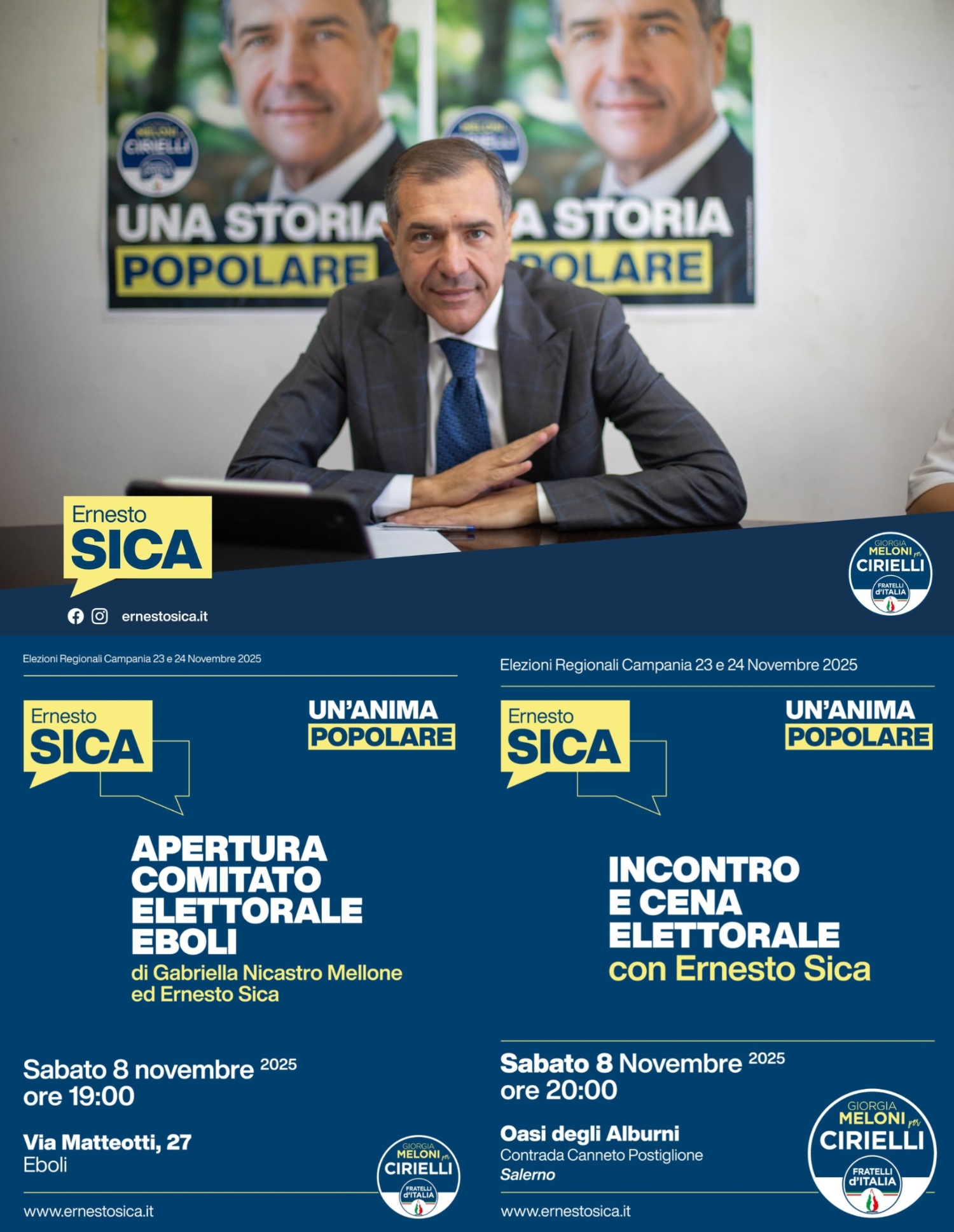 Alle 19:00 a Eboli per l’apertura del Comitato elettorale in via Matteotti 27; alle 20:00 a Postiglione per la cena elettorale all’Oasi Canneto di Postiglione. Doppio appuntamento elettorale per Ernesto Sica e la sua Partner elettorale Gabriella Nicastro Mellone candidati a sostegno di Cirielli nella Lista FdI.