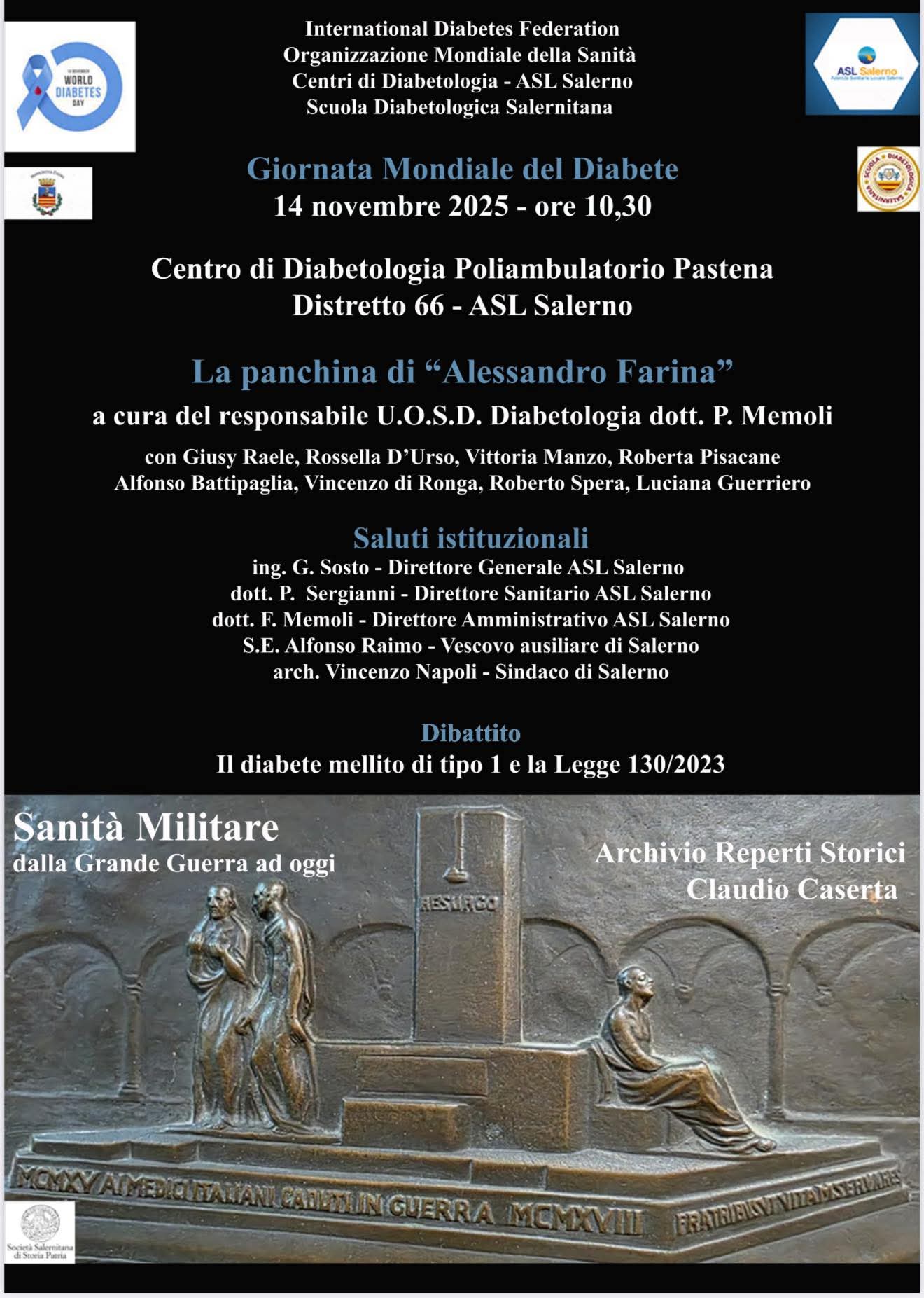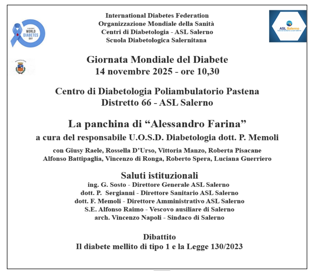 SALERNO – Nell’ambito della Giornata Mondiale del Diabete, presso il Centro di Diabetologia di Pastena, si terrà un incontro dibattito e dedica di una “panchina azzurra” ad Alessandro Farina.