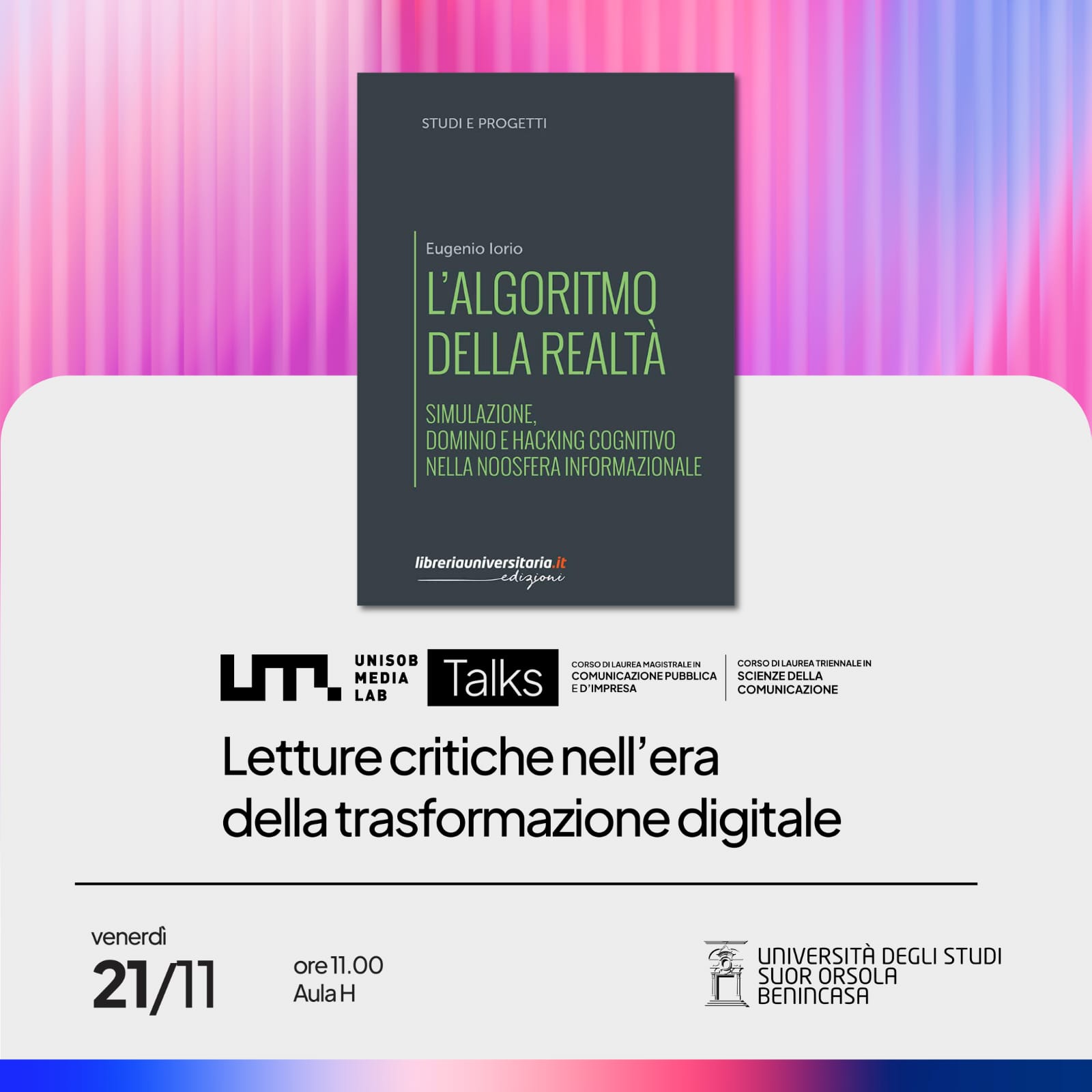 “Letture critiche nell’era della Trasformazione digitale”. Venerdì 21 novembre, ore 11,00, Aula H, Università degli Studi Suor Orsola Benincasa, presentazione del Libro “L’algoritmo della verità, simulazione, dominio e acking cognitivo nella noosfera Informazionale” di Eugenio Iorio.