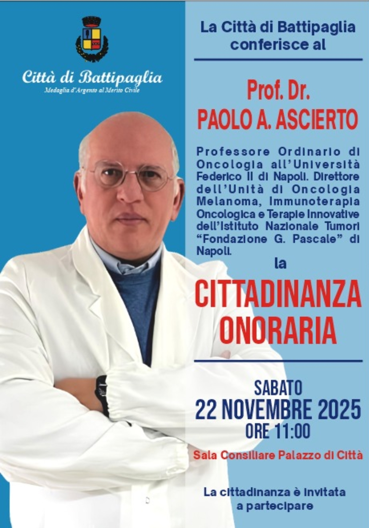 Sabato 22 novembre, ore 11,00, Aula Consiliare di Battipaglia, conferimento della Cittadinanza Onoraria al Prof. Dott. Paolo Antonio Ascierto, massimo esperto di melanoma al mondo, Prof. Ord. di Oncologia all’UniNa Federico II, e Direttore dell’istituto dei Tumori “Pascale” di Napoli.