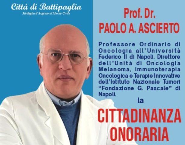 BATTIPAGLIA – Sabato 22 novembre, alle ore 11:00, all’interno dell’Aula consiliare del Comune di Battipaglia, l’Amministrazione Comunale conferirà la Cittadinanza Onoraria a Paolo Antonio Ascierto, Professore Ordinario di Oncologia all’Università Federico II di Napoli, Direttore dell’Unità di Oncologia Melanoma, Immunoterapia Oncologica e Terapie Innovative dell’Istituto Nazionale Tumori “Fondazione G. Pascale” di Napoli.