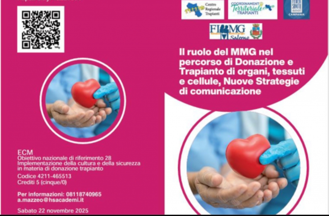 Sabato 22 novembre, alle ore 9.00, presso l’Ordine dei Medici e Odontoiatri di Salerno si terrà un convegno scientifico: “Il ruolo del MMG nel percorso di Donazione e Trapianto di organi, tessuti e cellule, nuove strategie di comunicazione”.