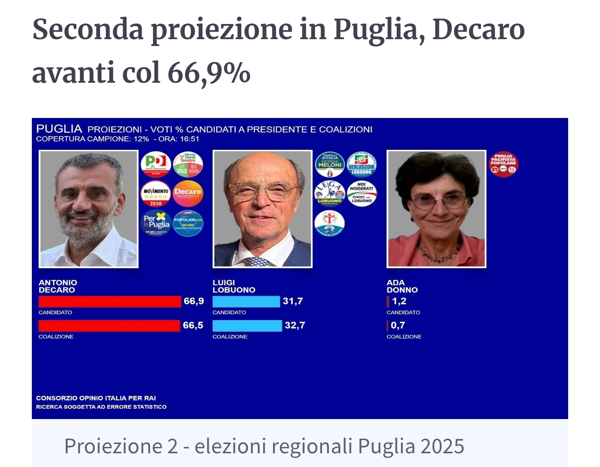- In Puglia, l’ex sindaco di Bari Antonio Decaro e candidato del centrosinistra (campo largo), a sfidare Luigi Lobuono, della coalizione di Centrodestra, Ada Donno e Sabino Mangano.