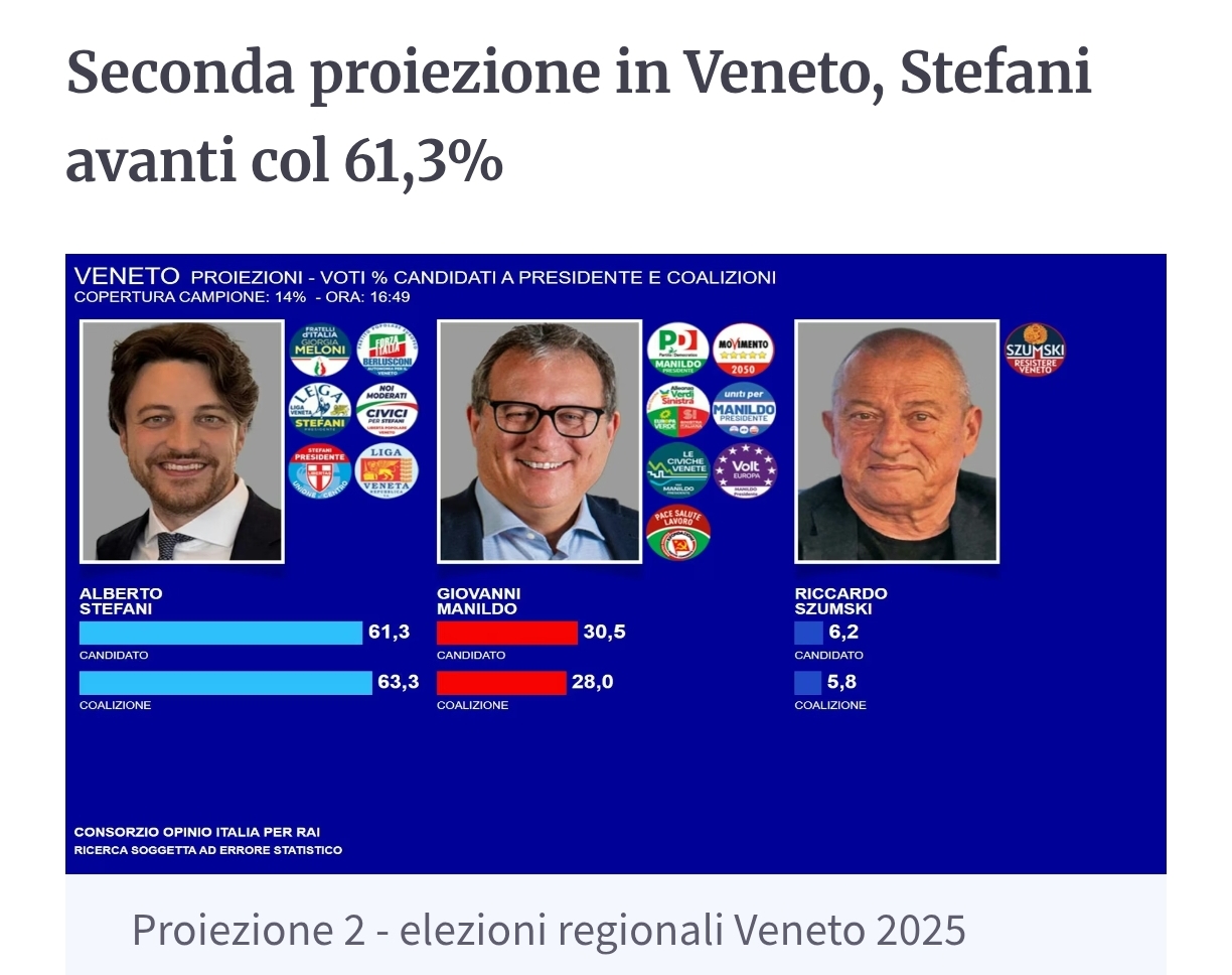 - Il Veneto che dopo 15 anni di Luca Zaia volta pagina deve scegliere tra Alberto Stefani, Giovanni Manildo, candidato del Centrosinistra (Campo Largo) , Riccardo Szumski, Fabio Bui e Marco Rizzo.