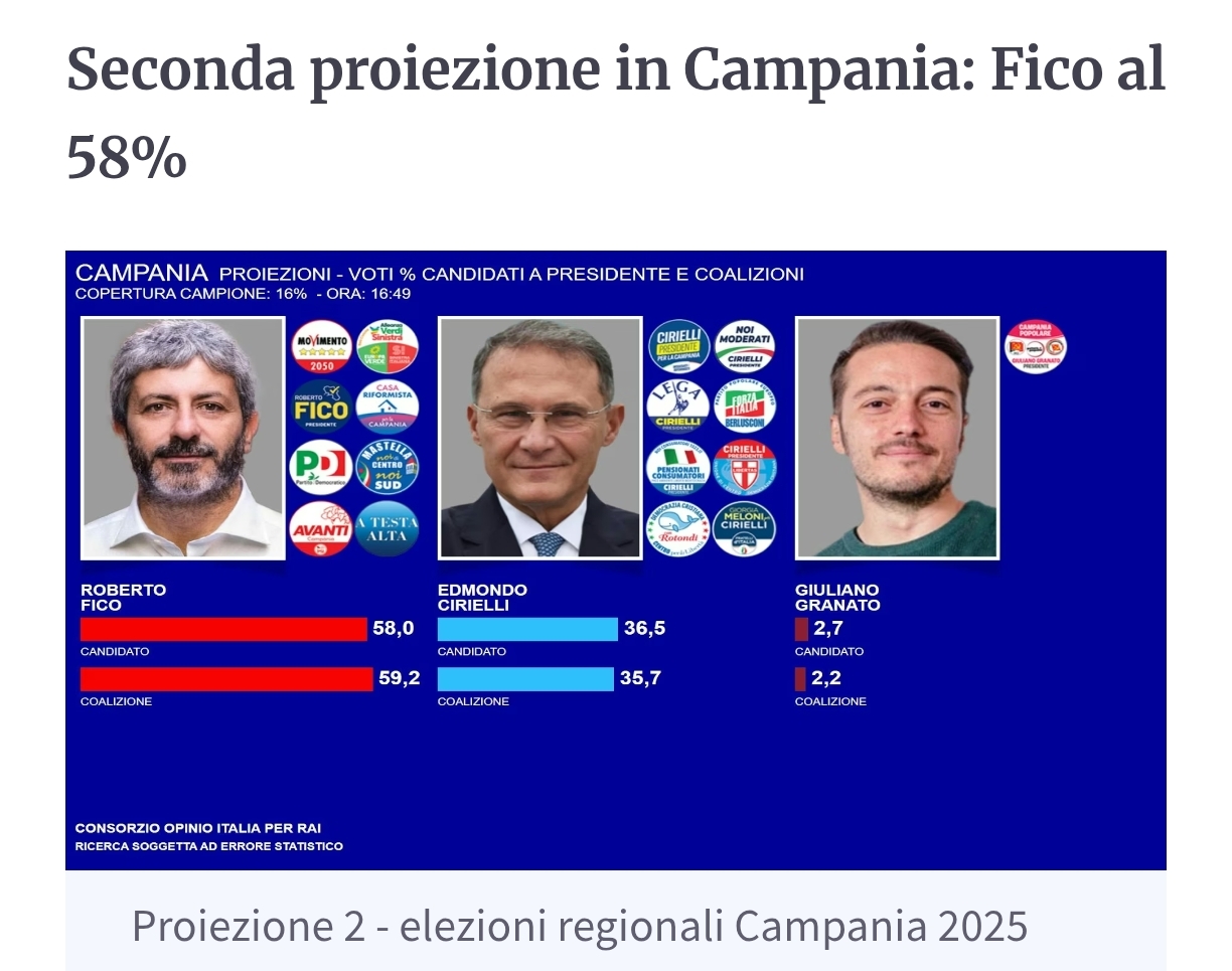 Proiezioni alle 17.00, tutto come nelle previsioni della vigilia: Campania e Puglia al centrosinistra con Decaro e Fico, in Veneto al centrodestra con Stefani. Affluenza in calo sotto al 45%. Le percentuali dei partiti. PD primo Partito, Forza Italia al Secondo posto