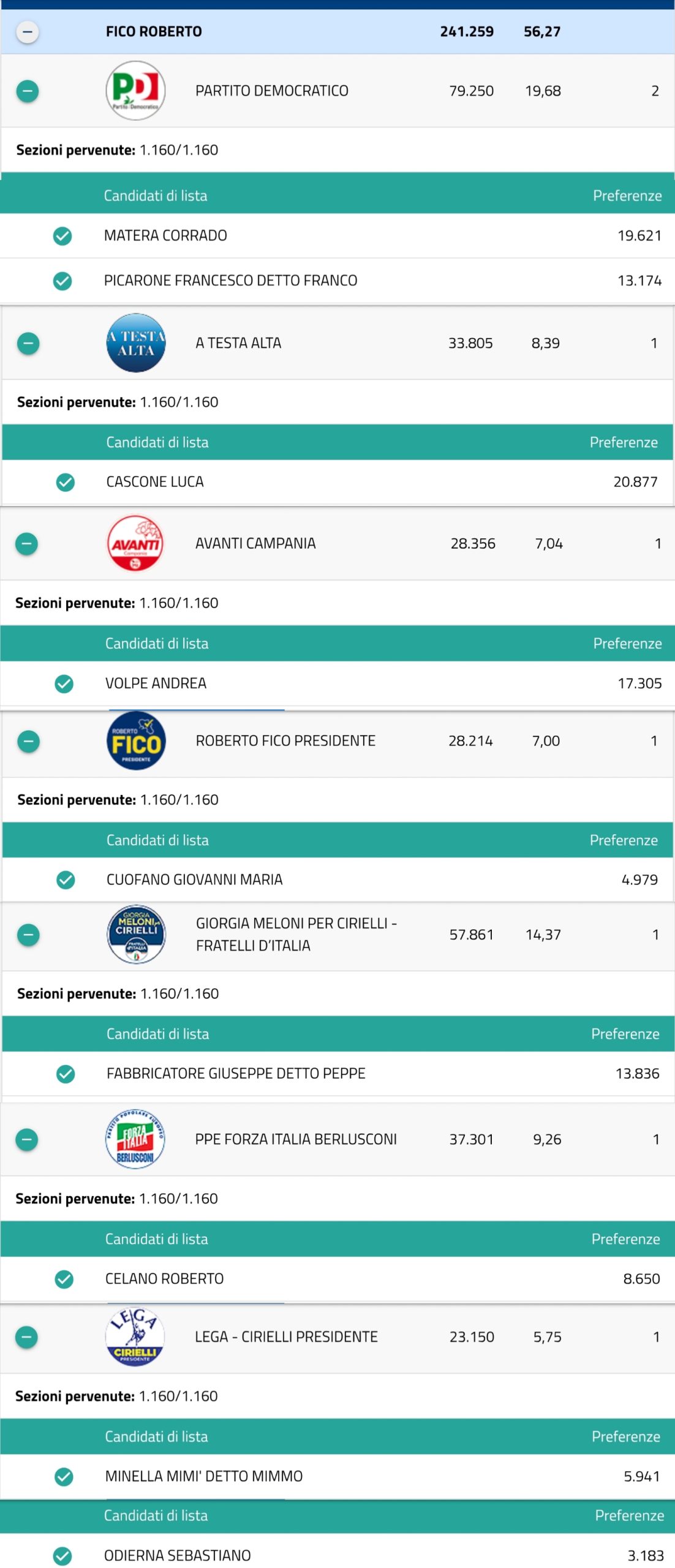 Eboli. Il centro sinistra vince con 61%. Il PD con il 28.7% dei voti è il primo Partito, FdI non arriva a 1000. L’OPA dei Conte sul PD è fallita. Federico è solo 5° nella Lista e con 1393 voti a Eboli perde anche lo scontro delle preferenze con la Rosamilia che con 1497 preferenze è la più votata. Gli eletti in regione.