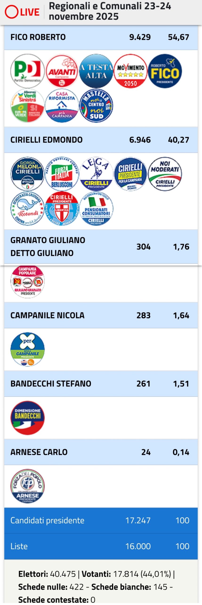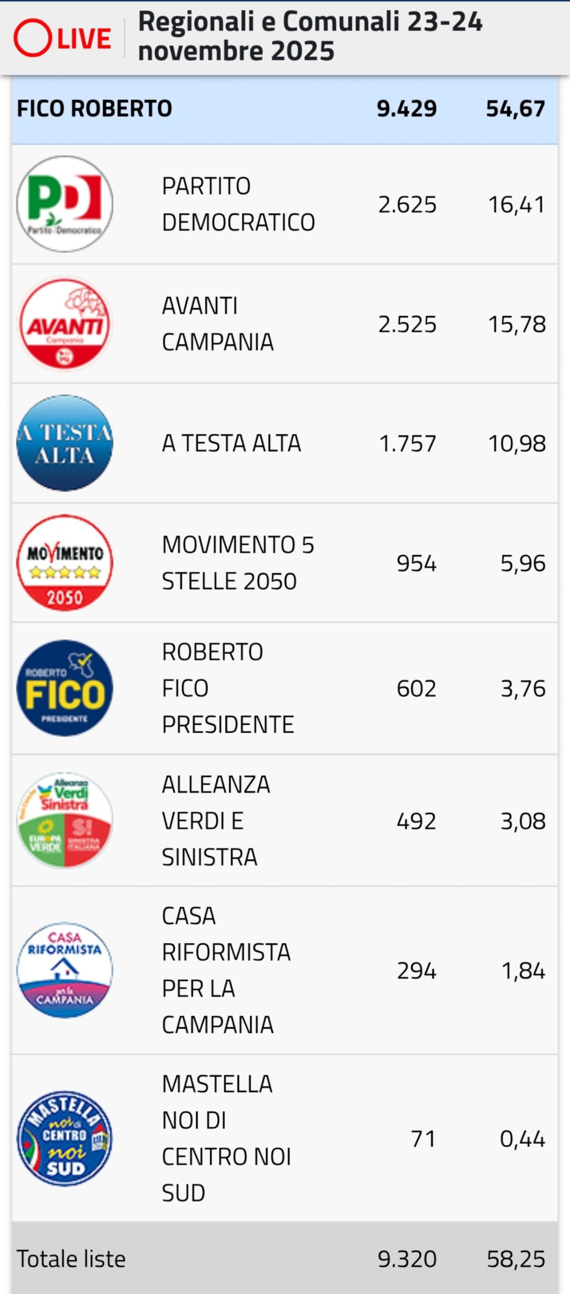 REGIONALI CAMPANIA ELETTI E PERCENTUALI PARTITI