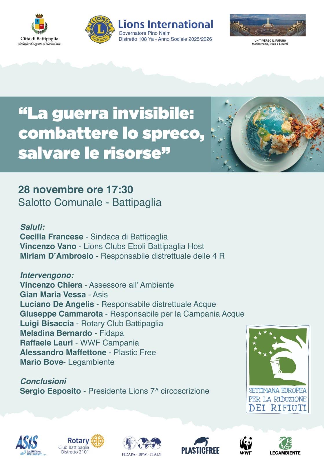 28 novembre, ore 17.30, Salotto Comunale, Palazzo di Città di Battipaglia, nell’ambito della Settimana Europea della Riduzione dei Rifiuti, si terrà l’incontro “La guerra invisibile: combattere lo spreco, salvare le risorse”.