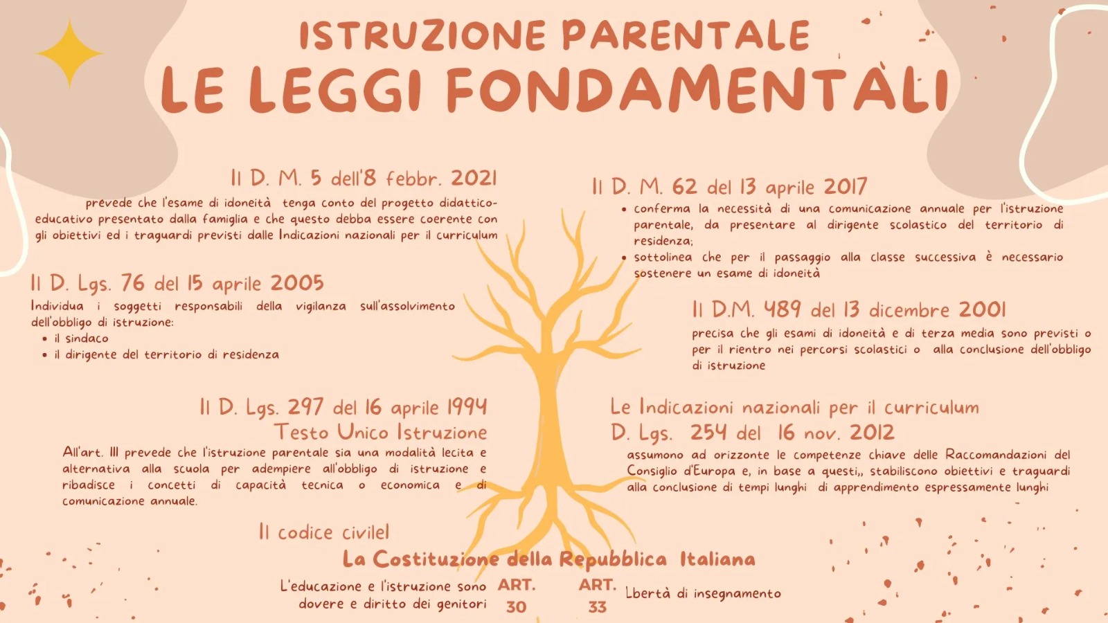 L’educazione è un diritto delle famiglie che corrisponde al diritto/dovere all’istruzione dei figli così come esplicitato dall’art. 30 della nostra Costituzione (“È dovere e diritto dei genitori mantenere, istruire e educare i figli …”). Tale articolo, in combinato con l’art. 31 (La Repubblica agevola con misure economiche e altre provvidenze la formazione della famiglia e l’adempimento dei compiti relativi […]”), l’art. 33 (L’arte e la scienza sono libere e libero ne è l’insegnamento. La Repubblica detta le norme generali sull’istruzione […]