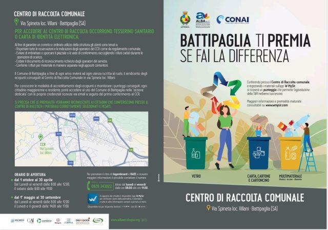 BATTIPAGLIA – Il Comune di Battipaglia, Alba Ecologia e CONAI presentano l’iniziativa “Battipaglia ti premia se fai la differenziata”. Se in regola con i pagamenti Tari i cittadini potranno conferire gli imballaggi in vetro, carta e cartone o il multimateriale anche presso l’Eco-Centro di Via Spineta con l’uso della tessera sanitaria. Registrando i materiali sull’app W-MySir, si riceverà un punteggio che permette l’agevolazione della TARI nell’anno successivo.