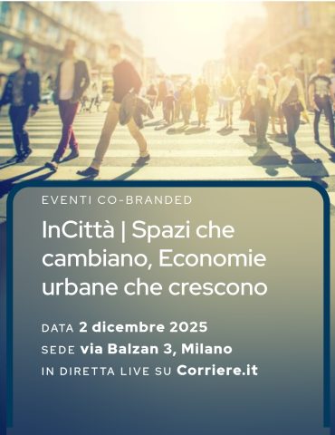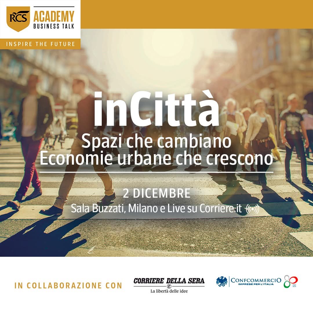 InCittà | Spazi che cambiano, Economie urbane che crescono – RCS Academy. Eventi co-Branded. Martedì 2 dicembre 2025, Sede via Balzan 3, Milano, in diretta live su Corriere.it. Una collaborazione: Loghi Business Talk Retail & Omnichannel Strategy Talk; Loghi BT Fonti alternative & Green Transition.