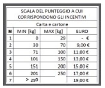 Gli incentivi in euro che verranno detratti dalla TARI sono attribuiti a coloro che conferiscono direttamente presso l’isola ecologica in sacchetto di carta o la scatola da imballaggio in cartone.I conferimenti non ordinari considerati “eccezionali” (grosse quantità di libri, riviste, giornali e simili, cartoni ecc.) il cui peso non rientra in quello di una produzione normale media (ovvero quelli con peso superiore a 300 kg annui), ma riveste appunto carattere di eccezionalità, verrà attribuito un valore massimo di 19,00 euro. Tutto questo al fine di evitare che l’utente possa conferire materiale prelevato e prodotto in comuni limitrofi.