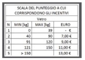 Per i cittadini che conferiscono direttamente presso l’isola ecologica il vetro pulito, verrà attribuito uno sconto sulla TARI di importo pari a massimo 13,00 euro. Ai conferimenti eccezionali, superiori alla media familiare, il cui peso non rientra in quello di una produzione normale media (ovvero quelli con peso superiore a 200 kg annui), ma riveste appunto carattere di eccezionalità, verrà attribuito un valore massimo di 13,00 euro.
