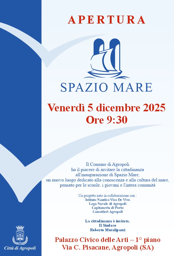 Venerdì 5 dicembre 2025, ore 9.30, Palazzo Civico delle Arti, Agropoli, cerimonia di apertura dello “Spazio Mare”, un nuovo ambiente tematico realizzato all’interno del Palazzo.