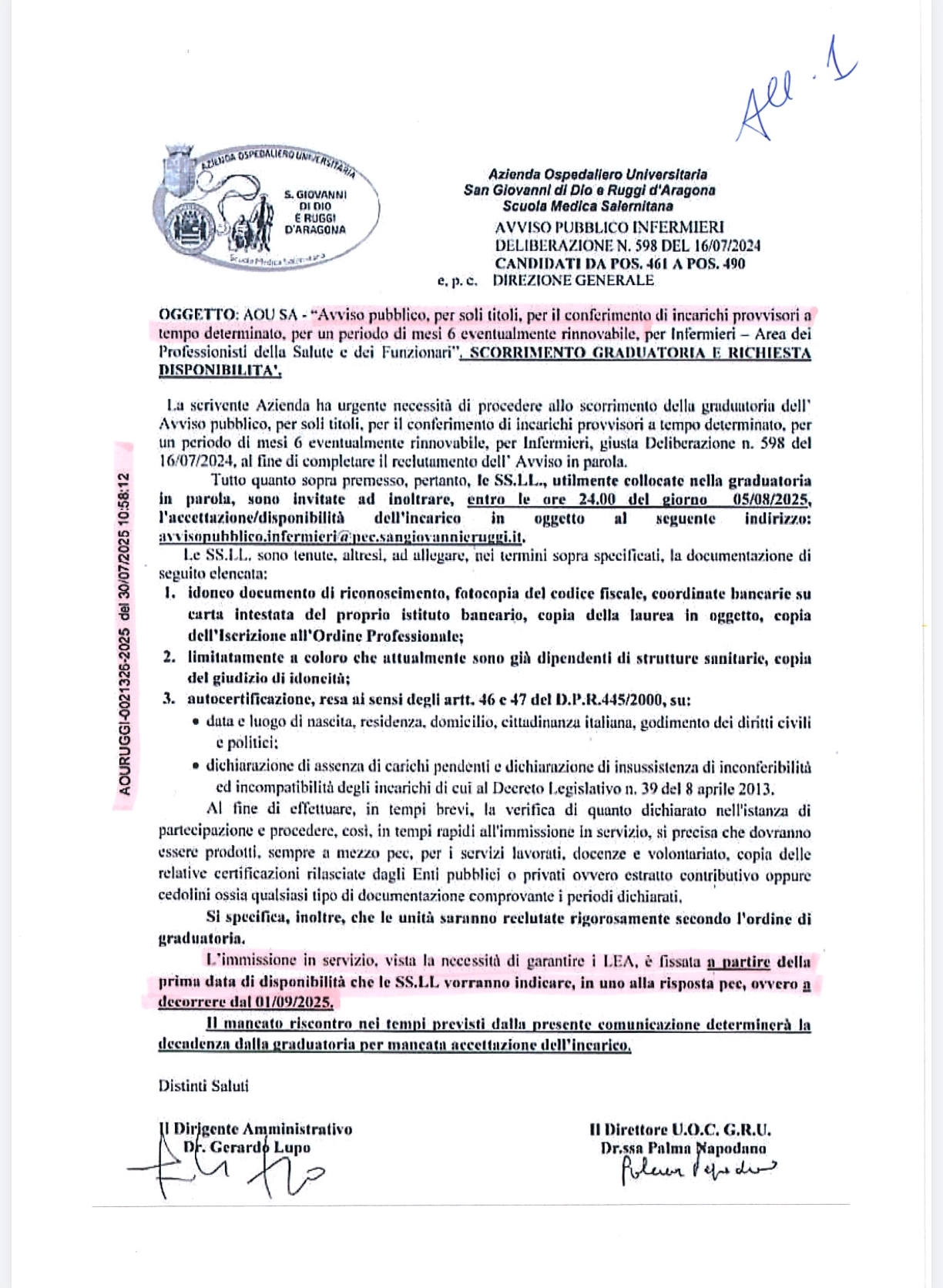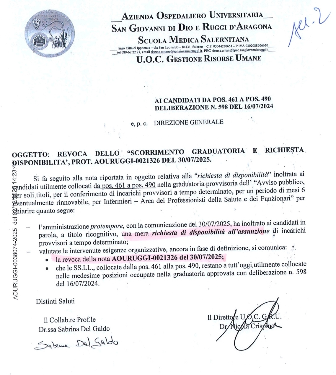 Nel corpo della richiesta di disponibilità inoltrata in data 30/07/2025 chiaramente si richiedeva per la immissione in servizio, vista la necessità di garantire i livelli essenziali di assistenza, di comunicare nella risposta la prima data disponibile che era fissata con decorrenza dal 01/09/2025, termine perentorio atteso che il mancato riscontro avrebbe determinato la decadenza dalla graduatoria. – prosegue Della Porta – È inutile dire che i termini della richiesta erano chiari e molti infermieri che operavano presso altre strutture sanitarie, per non incorrere nelle sanzioni previste per il mancato rispetto dei termini di licenziamento, in genere di 30 giorni, si sono visti costretti ad attivare immediatamente la procedura.