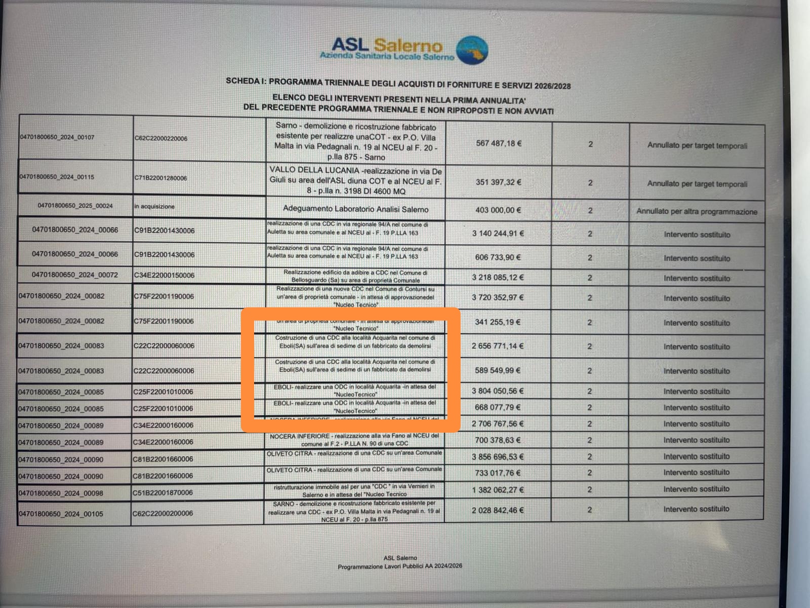 EBOLI – «Dopo il giallo dei 21 milioni di euro per interventi promessi dall’ex presidente regionale De Luca e sembra svaniti. – scrive in una nota Il rappresentante del Movimento 5 Stelle di Eboli, Erasmo Venosi riferendosi al finanziamento ottenuto e non appaltato per l’ammodernamento e la realizzazione di una nuova ala al Presidio Ospedaliero di Eboli – Risorse per interventi sull’ospedale di Eboli, un nuovo taglio di finanziamenti. La delibera n 1803 del 10 dicembre u.s. “PROGRAMMA TRIENNALE 2026-2027-2028 ED ELENCO ANNUALE 2026 DEI LAVORI PUBBLICI – adozione“ a firma del Responsabile tecnico e, con i pareri del direttore sanitario della Asl e del direttore amministrativo riporta in allegato “ELENCO DEGLI INTERVENTI PRESENTI NELLA PRIMA ANNUALITA’ DEL PRECEDENTE PROGRAMMA TRIENNALE E NON RIPROPOSTI E NON AVVIATI”.