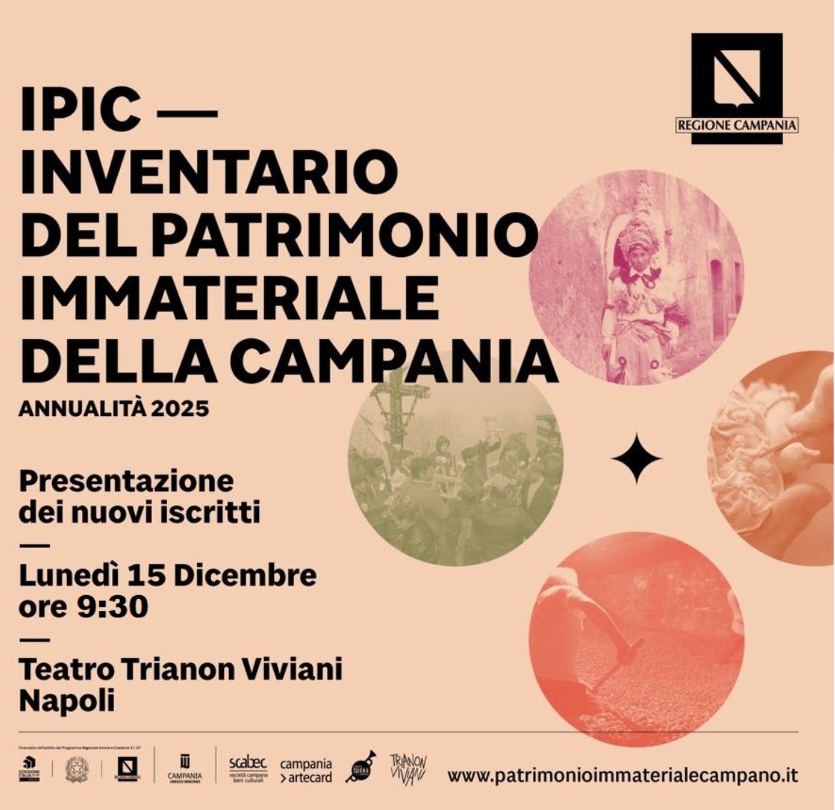 Lunedì 15 dicembre, alle ore 9.30, al Teatro Trianon Viviani di Napoli si terrà la presentazione dei nuovi iscritti all’Inventario del Patrimonio Immateriale della Campania (IPIC) e del catalogo aggiornato.