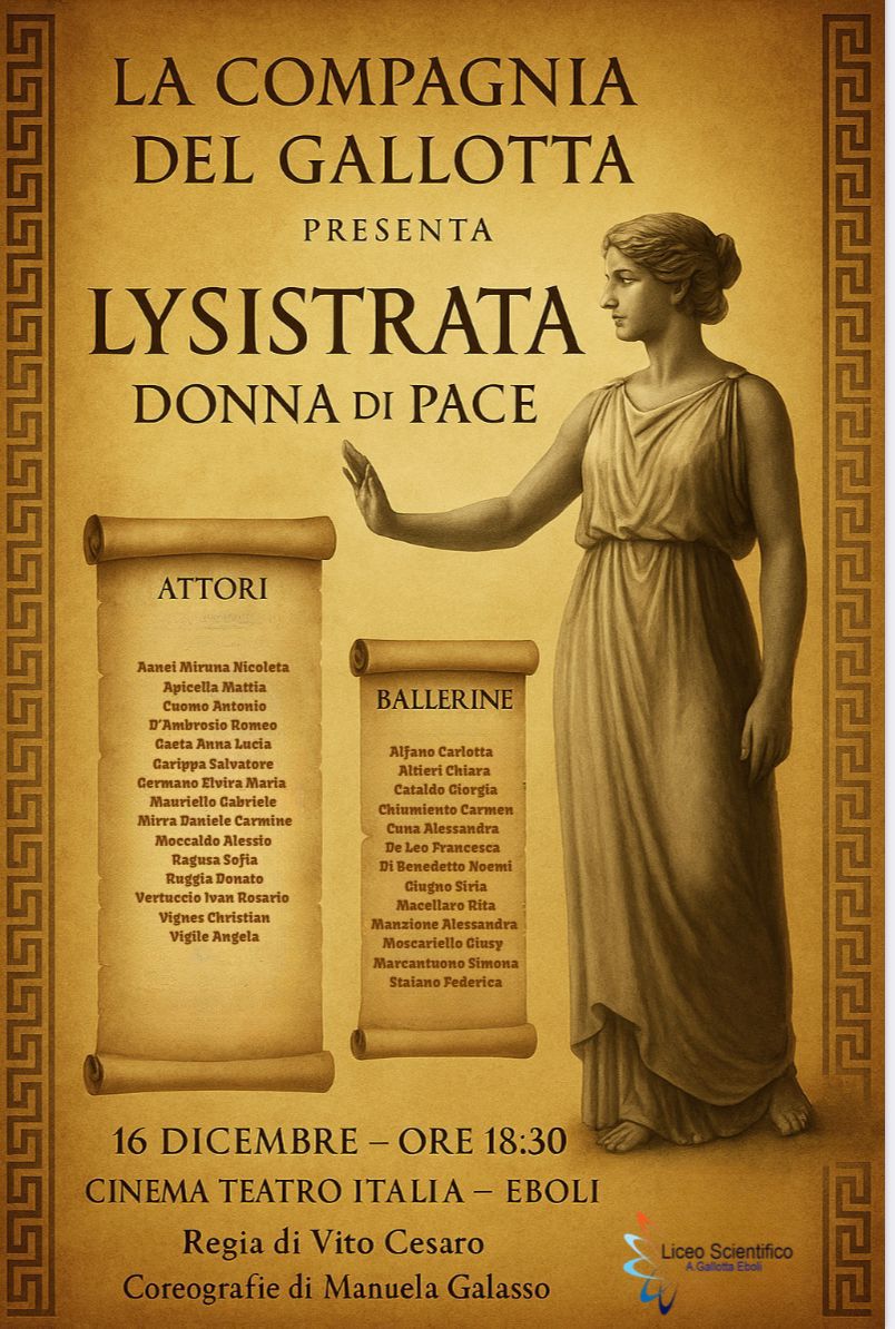 “Lysistrata. Donna di pace” contro la follia della guerra, gli alunni del Liceo Scientifico “A. Gallotta” di Eboli, lunedì 16 dicembre alle ore 18.30 nel Cinema Teatro Italia di Eboli, portano in scena un classico senza tempo.
