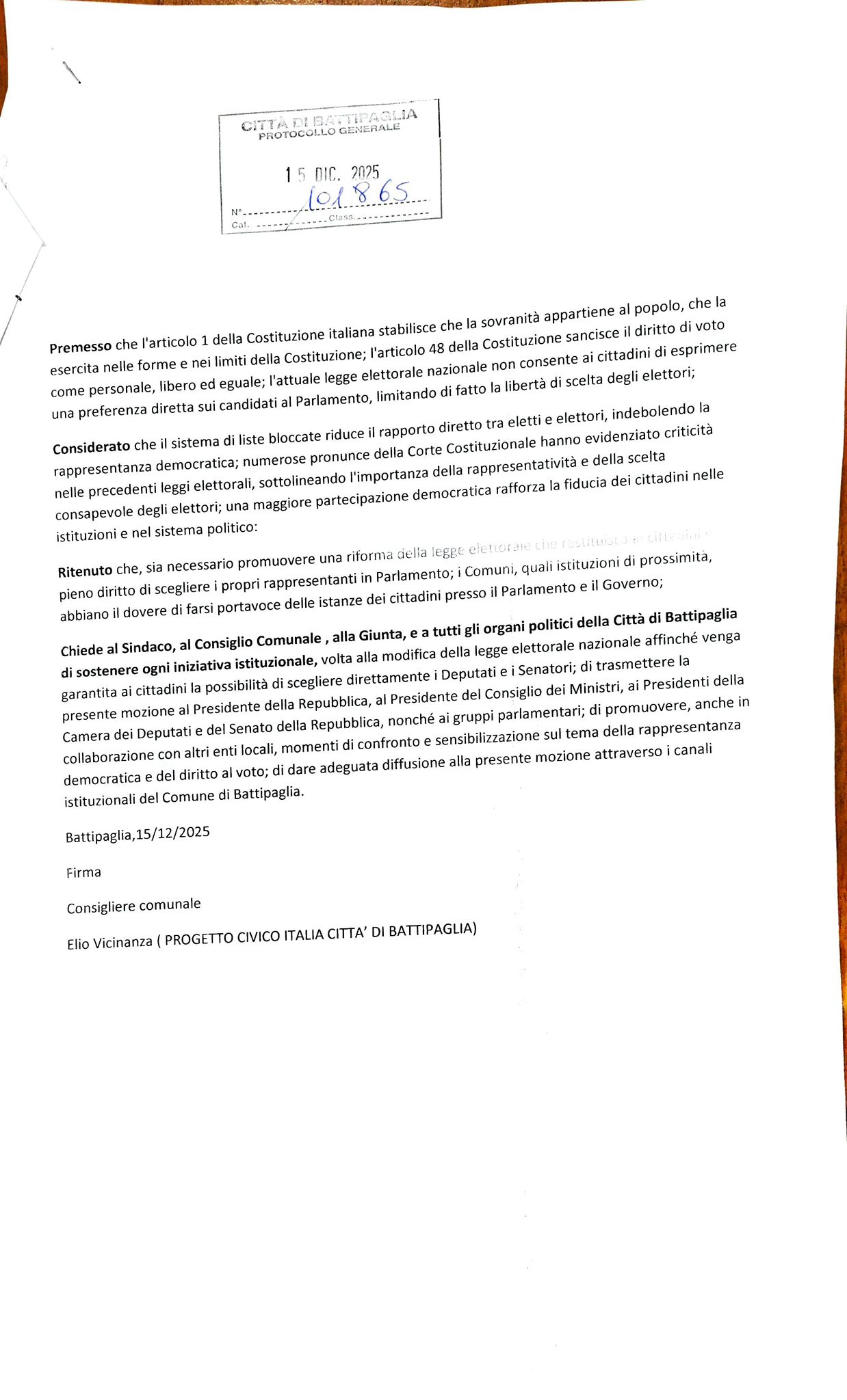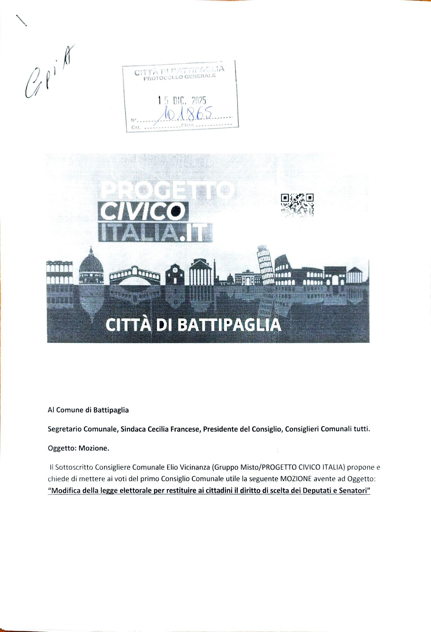 Progetto Civico Italia Provincia di Salerno-Città di Battipaglia, ha presentato una Mozione all’Amministrazione Comunale per far voto a reintrodurre le preferenze per la scelta di Deputati e Senatori.