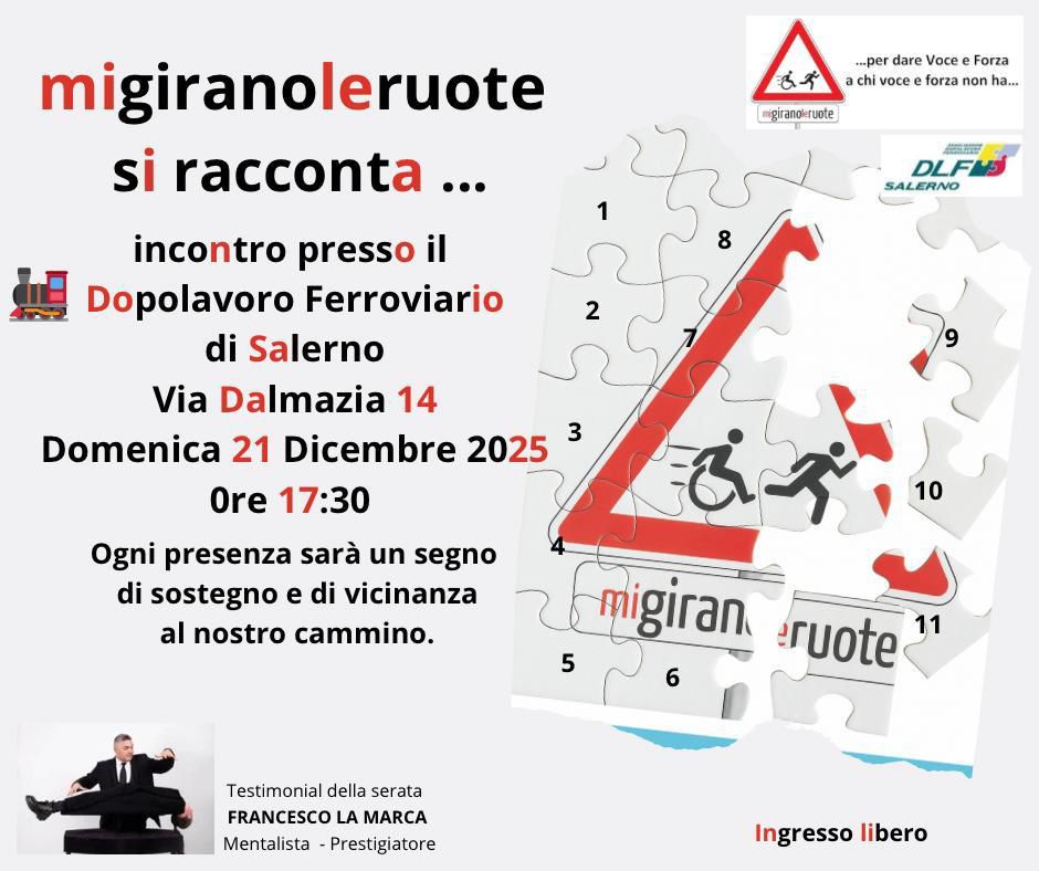 CAMPAGNA – Domenica 21 dicembre, alle ore 17.30, a Campagna (SA), nel Salone Parrocchiale della Chiesa San Giuseppe e San Michele Arcangelo del Quadrivio di Campagna “Mi Girano le Ruote” APS si racconta in un incontro pubblico aperto a tutta la cittadinanza.