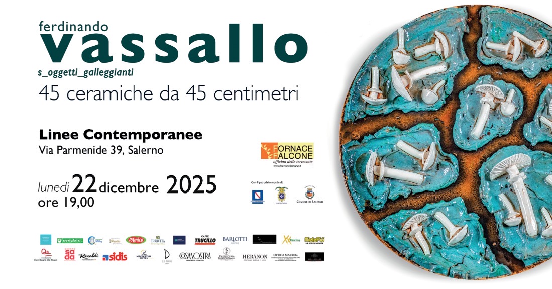 SALERNO – Con un rinnovato omaggio alla Cultura del nostro territorio, lunedì 22 dicembre 2025, alle ore 19.00, in via Parmenide presso “Linee Contemporanee” – arredamento e progettazione d’interni – Salerno, sarà inaugurata la mostra “45 Ceramiche da 45 cm” del maestro Ferdinando Vassallo. Saranno esposti 45 piatti di ceramica, ognuno dei quali, del diametro di 45 cm, è autografato ed è unico.