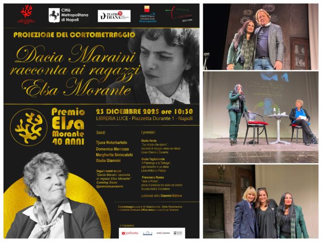 NAPOLI – Continuano gli appuntamenti del Premio Elsa Morante, che quest’anno celebra il traguardo della sua 40esima edizione. Martedì 23 dicembre alle ore 10:30, presso “Luce – Libreria Emotiva”, Piazzetta Durante 1, di Lorenzo Marone e Roberta Nicodemo, si terrà la proiezione del cortometraggio dedicato all’anteprima di quest’anno in cui Tiuna Notarbartolo intervista Dacia Maraini, scrittrice candidata al Nobel e storica presidentessa della giuria del Morante.