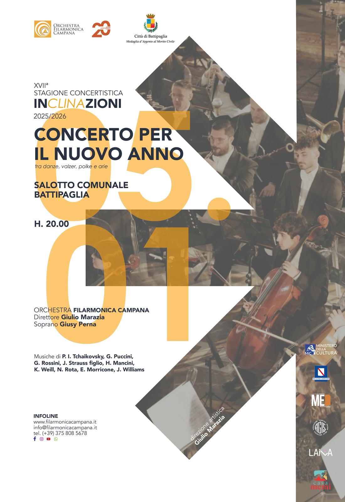 BATTIPAGLIA – 5 gennaio 2025 La Tradizione si Rinnova anche quest’anno con il tradizionale concerto nel Salotto Comunale a Palazzo di Città di Battipaglia darà il benvenuto al NUOVO ANNO, e sarà, come sempre, l’occasione per fare a tutti gli auguri di un sereno 2026 di pace e di benessere
