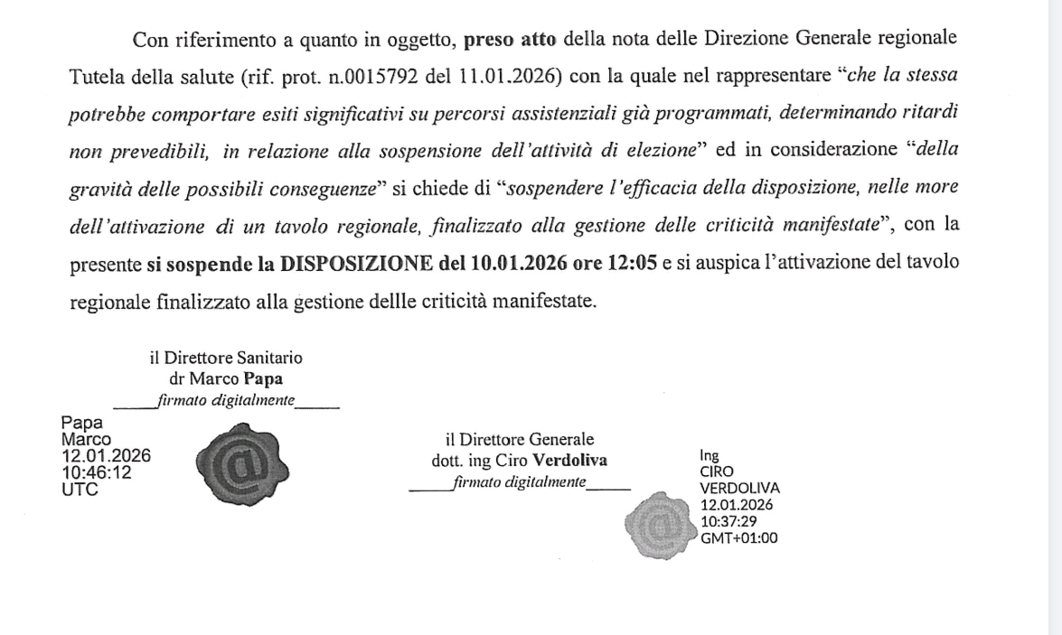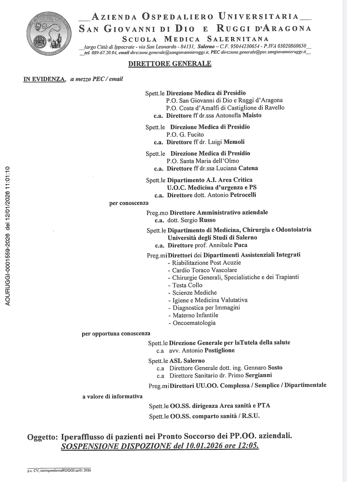 SALERNO – La Direzione Generale dell’AOU San Giovanni di Dio e Ruggi d’Aragona di Salerno, si ritiene molto soddisfatta in seguito all’attenzione che la Direzione Generale Regionale Tutela della Salute, ha riservato alla recente disposizione del 10/01/2026. La sopracitata Direzione Generale dell’AOU Ruggi, accoglie favorevolmente l’invito a sospendere l’efficacia di tale disposizione, auspicando in tempi brevi, la convocazione del tavolo regionale, finalizzato ad affrontare la gestione di tali criticità.