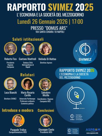 NAPOLI – Lunedì 26 gennaio 2026, alle ore 17:00, presso la Domus Ars, in via Santa Chiara 10, Napoli, si terrà la presentazione del Rapporto SVIMEZ 2025 – L’economia e la società del Mezzogiorno, uno dei principali appuntamenti di analisi e riflessione sulle dinamiche socio-economiche del Sud Italia. L’iniziativa, organizzata e coordinata da ASPROM – Associazione per lo Sviluppo e la Promozione del Mezzogiorno, offrirà un quadro aggiornato delle trasformazioni economiche, sociali e demografiche che interessano il Mezzogiorno, mettendo in luce criticità strutturali e nuove opportunità di sviluppo nel contesto nazionale ed europeo.