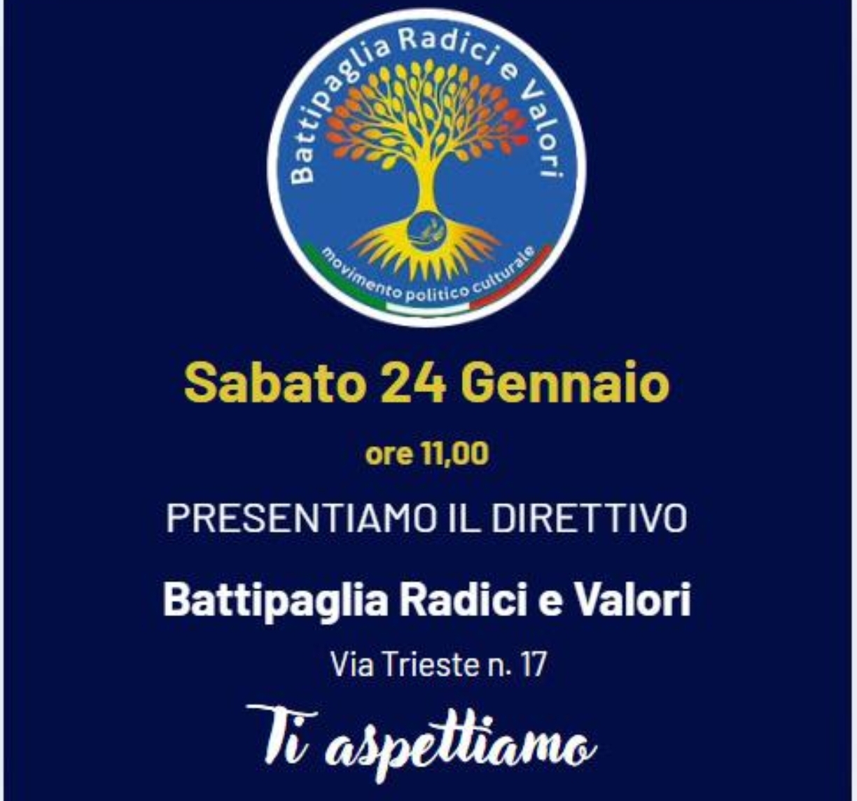 È stata convocata per Sabato 24 febbraio alle ore 11,00 una Conferenza stampa di Battipaglia Radici e Valori per presentare il Direttivo e discutere della crisi Amministrativa in relazione alla scadenza elettorale amministrativa.