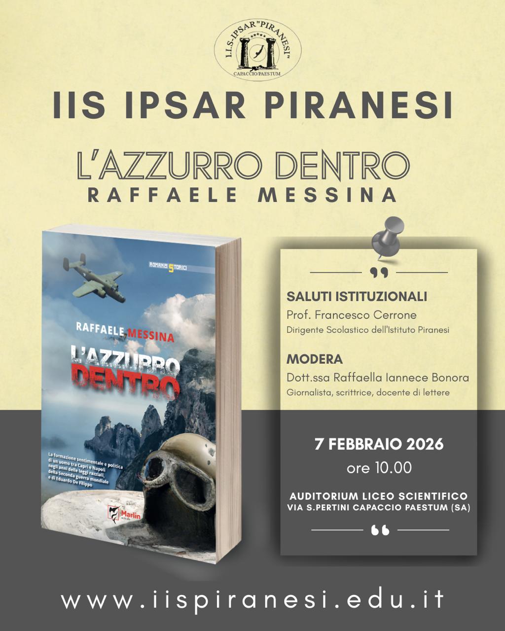 Venerdì 7 febbraio 2026, alle ore 10.00, presso l’Auditorium del Liceo Scientifico dell’IIS IPSAR Piranesi di Capaccio Paestum, presentazione del romanzo “L’azzurro dentro” di Raffaele Messina.