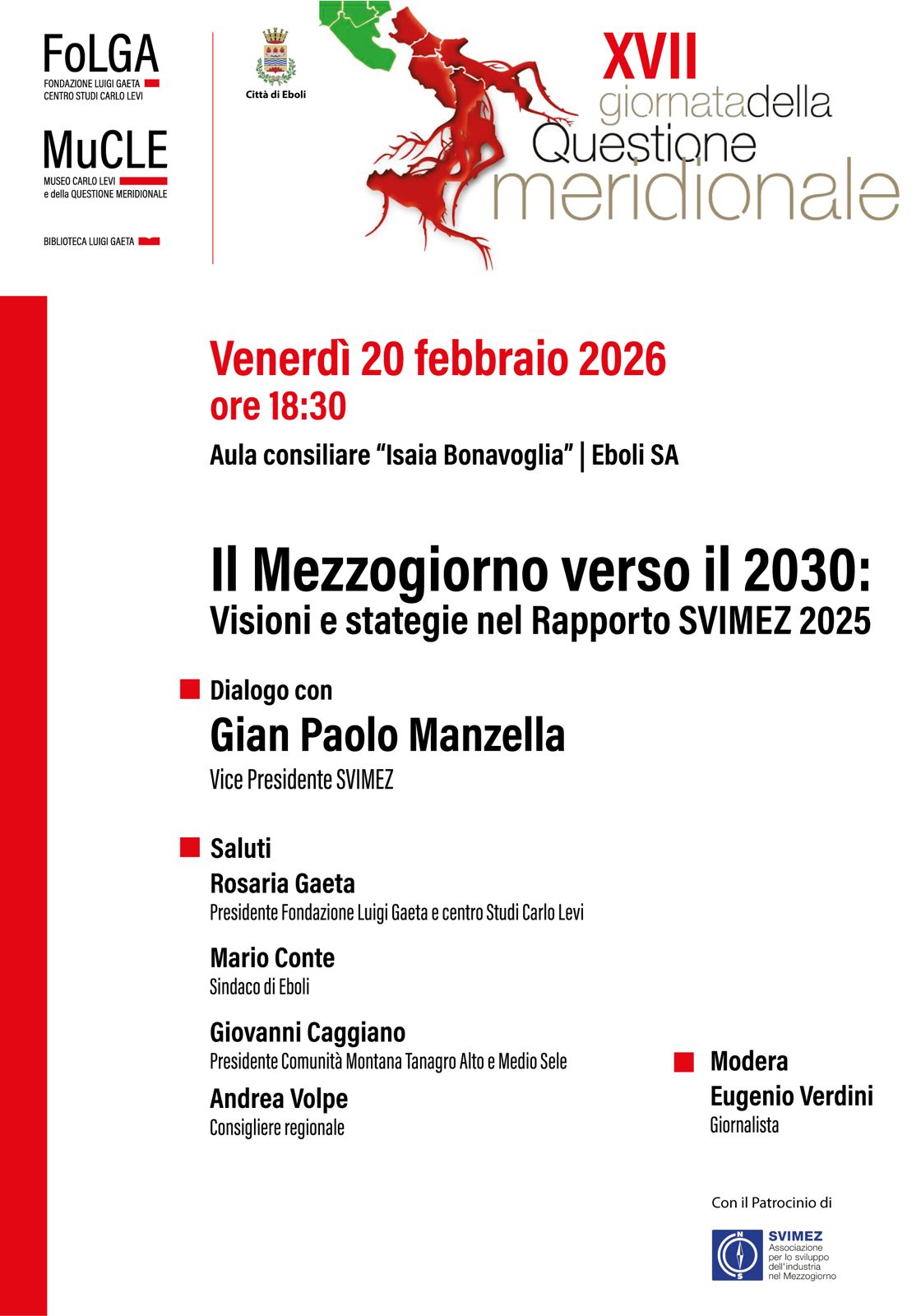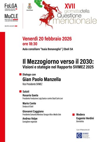 Una giornata che sarà una occasione di dialogo e di confronto con Gian Paolo Manzella, Vice Presidente SVIMEZ, per approfondire le strategie per il Sud verso il 2030. Un momento di confronto istituzionale importante, promosso dalla Fondazione Luigi Gaeta Centro Studi Carlo Levi (FOLGA), dal Museo Carlo Levi e della Questione Meridionale (MuCLE), e dalla Biblioteca Carlo Levi, in collaborazione con il Comune di Eboli per discutere concretamente del futuro economico e sociale del Mezzogiorno; un focus necessario tra analisi dei dati e visione politica, per non restare spettatori del cambiamento ma diventarne protagonisti.